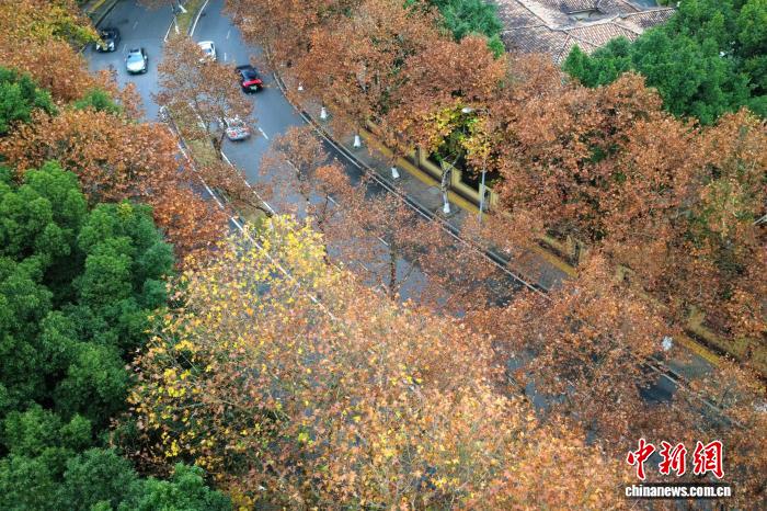 图为梧桐树叶色调鲜艳好如绘。记者 肖江川 摄